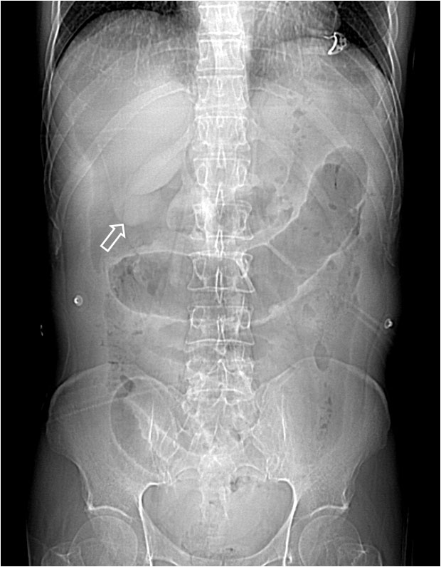 Referencia: Radin, R y cols. The visible gallbladder: a plain film sign of pneumoperitoneum. AJR 1996; 167: 69-70.