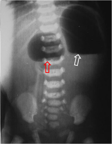 SIGNO DE LA DOBLE BURBUJAdoble burbujaSigno de obstrucción duodenal visible en la radiografía simple de abdomen del neonato, que consiste en la distensión por gas del estómago (flecha blanca) y de la porción del duodeno proximal a la obstrucción (flecha roja). Las causas incluyen: atresia duodenal, páncreas anular, vólvulo intestinal, membrana duodenal, malrotación y vena porta preduodenal.