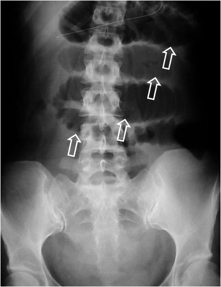Este signo también se ha llamado Signo del rosario de cuentas. Aquí vemos un ejemplo en un cuadro obstructivo de delgado:rosario de cuentas