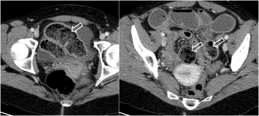 En las imágenes vemos este signo (flechas blancas) en una paciente con fibrosis quística y síndrome de obstrucción de intestino distal.