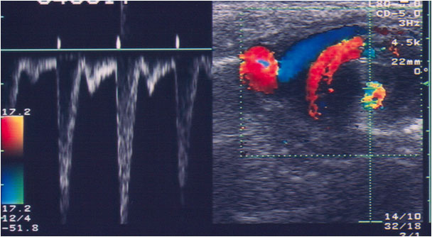 La imagen de la izquierda muestra el espectro del doppler en el que se observa un patrón de alta velocidad. A la derecha, la imagen en modo B corresponde al arremolinamiento de los vasos mesentéricos.