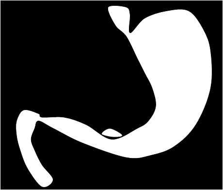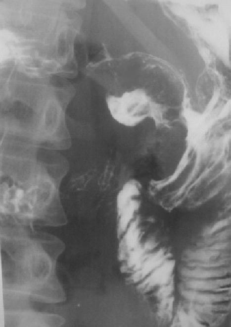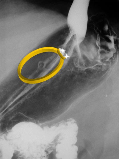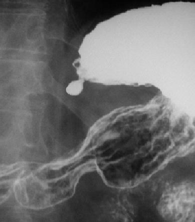 En esta fotografía vemos otra imagen de adición de bario elíptica pero esta vez junto al fundus gástrico. A diferencia de la anterior, el eje mayor de esta elipse es perpendicular a la luz gástrica, por lo que no corresponde a una lesión ulcerosa. Se trata de un divertículo fúndico.