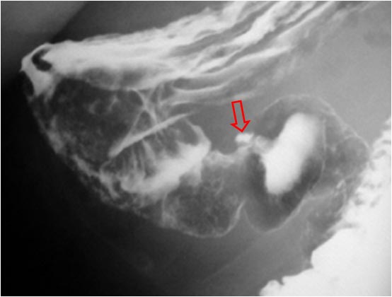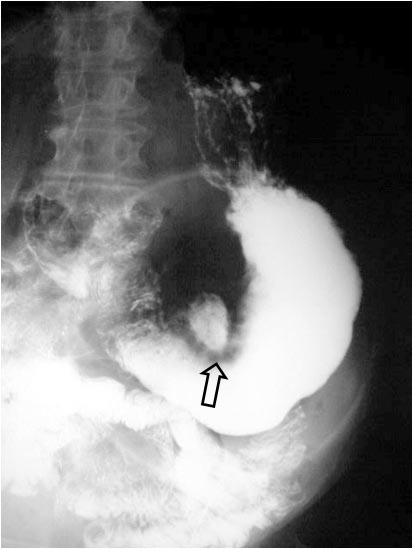 En la imagen, una úlcera pilórica (flecha) visible como una imagen de adición de bario de forma elíptica irregular, cuyo eje mayor es paralelo a la luz antral.