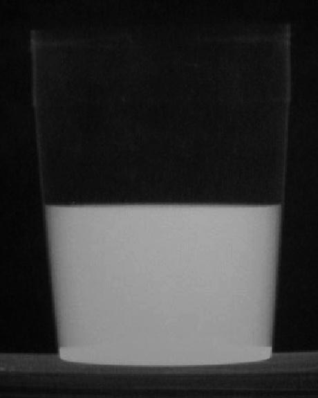 La fotografía muestra un líquido de alta densidad en un tarro de orina, con un poso de bario en el fondo.
