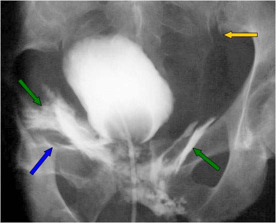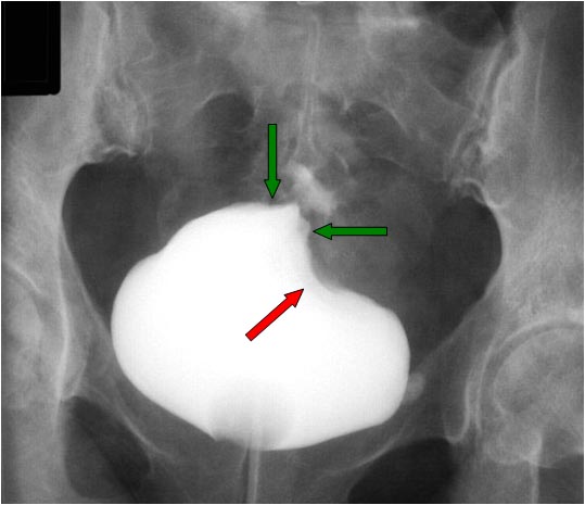 La demostración de una fístula colo-vesical puede ser difícil con radiología. El enema opaco, la cistografía y la TC pueden no llegar a demostrarla. Sin embargo, la presencia de contraste baritado tras un enema opaco en una muestra de orina, detectado mediante una radiografía de la muestra, es signo de fístula colo-vesical, aunque no se demuestre ésta con otros métodos de imagen.