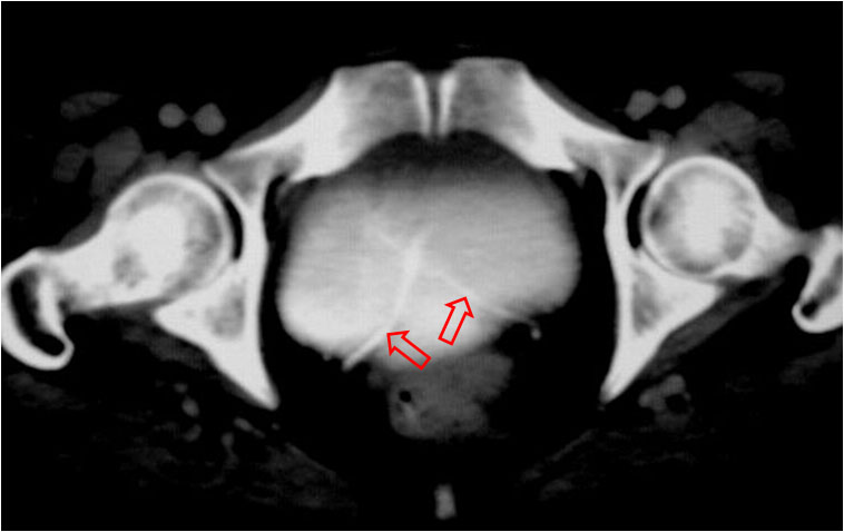 En la imagen vemos la vejiga de pera en un paciente con traumatismo pélvico. Puede verse la fractura de la rama iliopubiana izquierda y la fractura de ala sacra con luxación sacroilíaca izquierda.