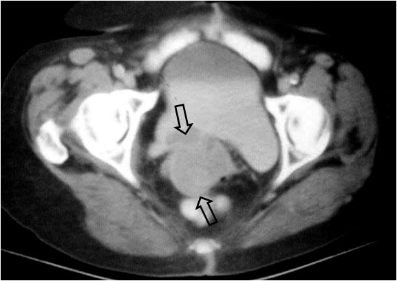 La imagen de TC corresponde a la misma paciente de la urografía, que presenta un tumor de cuello uterino -flechas negras- que infiltra la vejiga. Se trataba de un adenocarcinoma mucosecretor. La imagen recuerda a la impronta prostática en el TC.