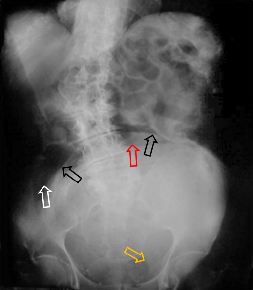Las flechas negras marcan el borde superior vesical bien definido. Obsérvese el borramiento de planos grasos en la pelvis (flecha naranja), el desplazamiento lateral del ciego (flecha blanca) y superior del sigma (flecha roja).