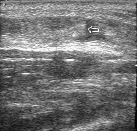 Signo ecográfico de rotura muscular en el corte transversal al eje del músculo. El signo corresponde al músculo retraído rodeado de un halo de hematoma.