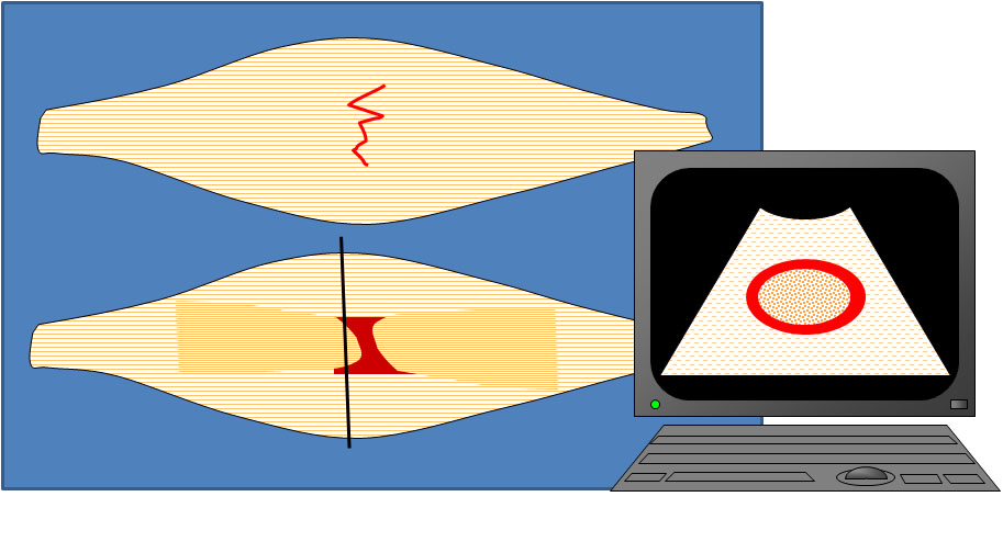 En este esquema está representado un fragmento muscular que sufre una rotura (arriba). Abajo, las fibras afectadas por la rotura se retraen y aparece un hematoma (en rojo) en la zona de la sección de fibras. La “punta” del haz de fibras roto impronta en la zona del hematoma con un aspecto que ha sido definido como signo del badajo de campana (flecha).