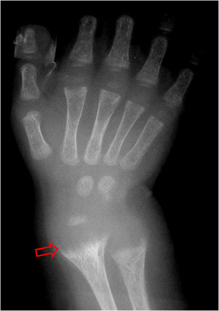 Aumento de densidad de las metáfisis (flecha) visible en la radiografías convencionales, no acompañado de aplanamiento o deformidad del hueso. Corresponde a una rápida deposición de calcio en las metáfisis que acontece después de varias circunstancias en las que se compromete la osteogénesis. El resultado es el aumento del número y grosor de las trabéculas óseas en las metáfisis.