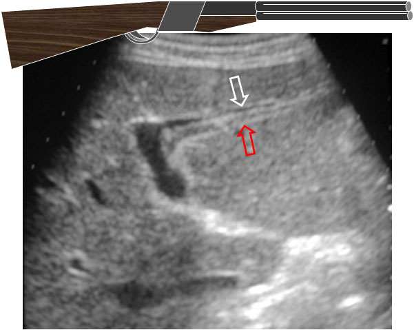Signo clásico en ecografía de dilatación de la vía biliar intrahepática. Un conducto biliar dilatado –flecha roja- corre paralelo a la rama portal acompañante –flecha blanca-, con calibre similar, dando una imagen de escopeta de doble cañón.