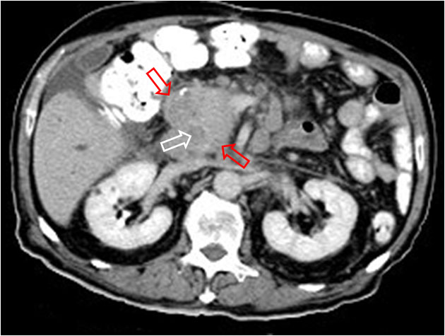 Un corte más caudal muestra una masa en la cabeza del páncreas (flechas rojas) causante de la dilatación biliar (flecha blanca).