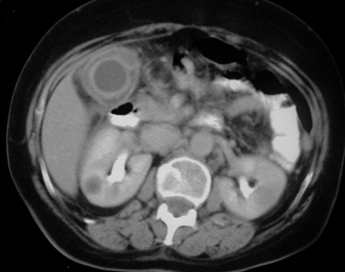 Otro paciente con colecistitis en el que se aprecian claramente las tres capas de la pared vesicular.